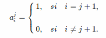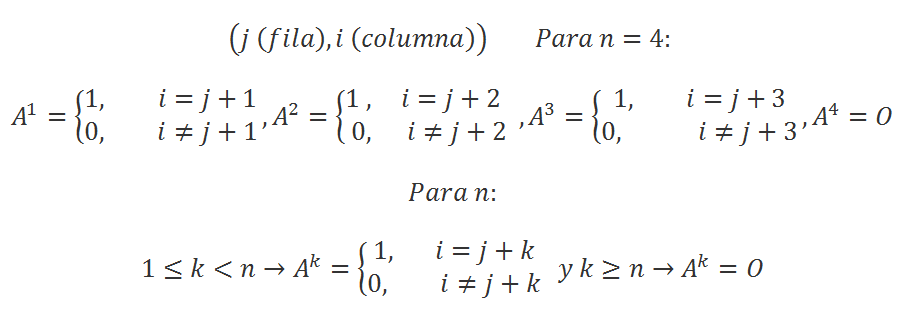 Sólo son no nulos iguales a uno, los elementos justo encima de la diagonal. Por ejemplo para una matriz cuadrada de orden 4: