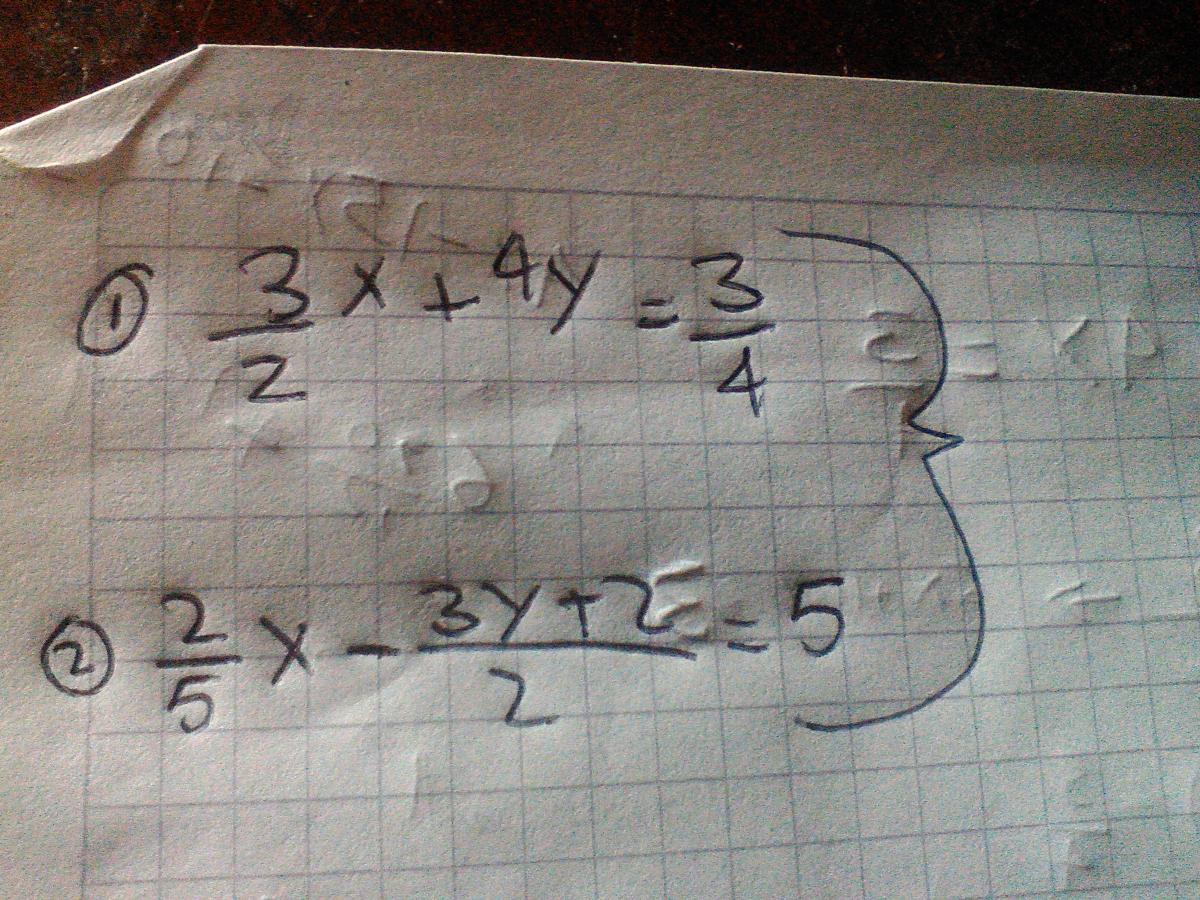 Puedes multiplicar por 4 en todos los términos de la primera ecuación, y por 10 en los de la segunda (aquí debes prestar atención al signo en el segundo término), y queda: