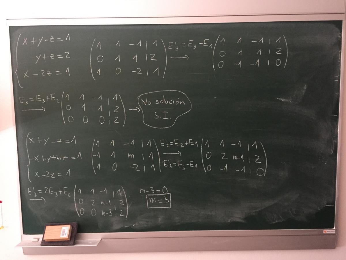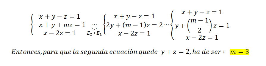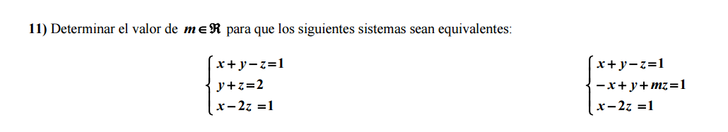 Para que los sistemas sean equivalentes el conjunto solución tiene que ser el mismo verdad? A mi se me ocurrió buscar primero el conjunto solución del primer sistema y después con esos valores ir al otro sistema y buscar m. Pero en el primero sistema z me da 0, y cuando voy con ese valor al otro sistema, m se anula. No se me ocurre que otra cosa hacer...