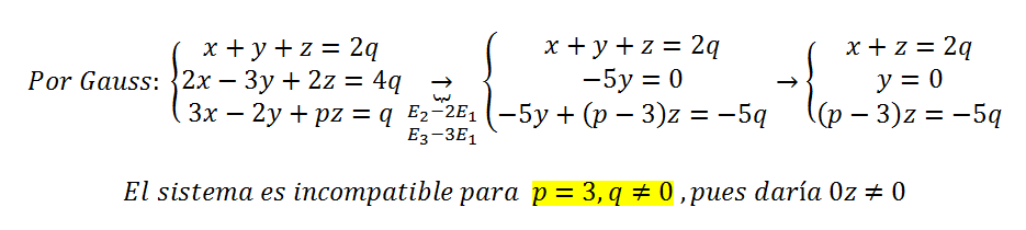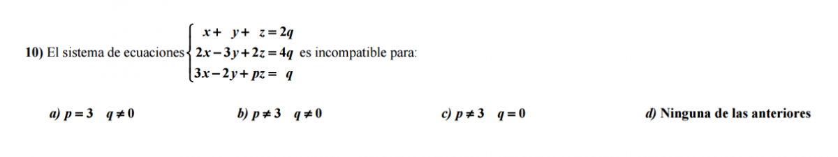 Se que para que el sistema sea incompatible, el rango de la matriz de los coeficientes y el rango de la matriz ampliada tienen que ser distintos. Supuestamente la respuesta correcta es la a). Lo resolví en base a eso usando Gauss, y q sí me da distinto de cero, pero p me da 4 no 3.
