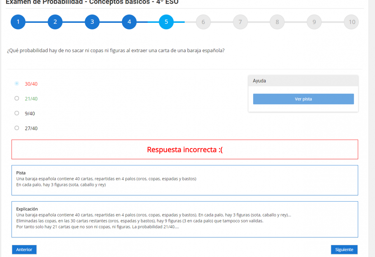 Creo que esté ejercicio está mal corregido , si me dices que en un pack de 40 hay 4 palos, que son son espadas, copas , oros y bastos, +3 Figuras , deduzco que son ( No figuras 7 + 3 Figuras ) por cada 4 pack , que serían 12 Figuras y 24 No Figuras, no 9 Figuras y 30 no figuras :S