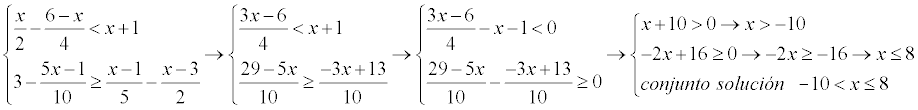 Resolver los siguientes sistemas de inecuaciones de 1er grado con una incógnita, indicando la solución de dos formas distintas: mediante intervalos, y representando en la recta real: