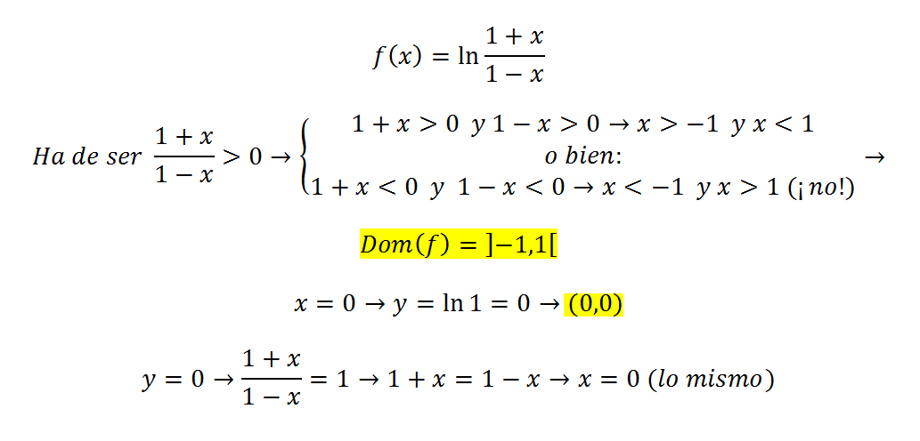 1) Sea f(x)= ln(1+x)/(1-x) a) Comprueba que Dom(f)=(-1,1) y determina los cortes con los ejes (si los tiene)