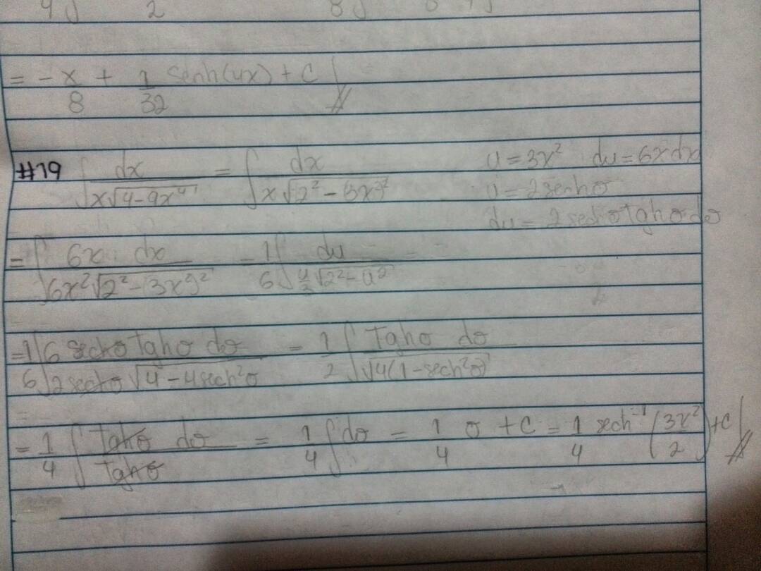 Buenas, quisiera saber si esta integral esta buena, es una integral hiperbolica, aunque el resultado del libro dice negativo, a mi me da positivo