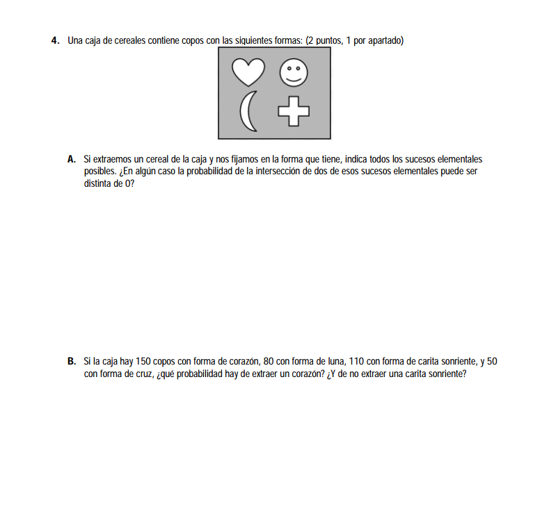 observa que cada copo tiene una sola forma, por lo que no es posible extraer un copo que tenga dos o más formas a la vez, por lo que la probabilidad de la intersección entre dos sucesos es igual a cero.