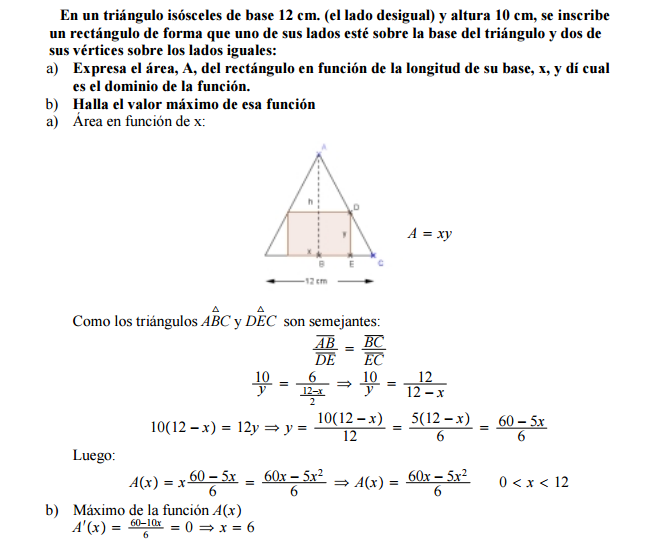 Dado un triangulo isosceles de base 8cm y altura 5cm, calcular las dimensones del rectangulo de area maxima que puede inscribirse dentro de dicho triangulo.