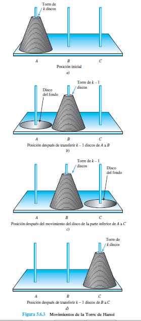El problema de las torres de Hanoi. En un tablón tenemos clavados tres postes verticales. En uno de ellos, el poste A, hemos colocado n discos en orden creciente de tamaño de arriba hacia abajo. Los queremos pasar al palo B utilizando el palo C. Los discos los podemos mover de uno a uno y colocarlos donde queramos siempre que ningún disco esté tapando uno más pequeño. [Si los suponemos opacos, siempre se deben ver todos].