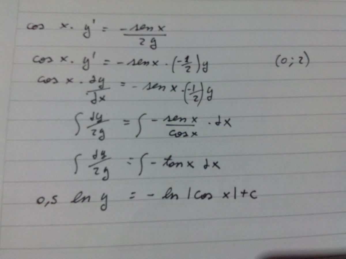 Como se continua esto???? Nose como seguirla ayudaaaaaaa!!!!! Es la ecuacion diferencial cos x. y´= -sen x/2y en punto (0,2)