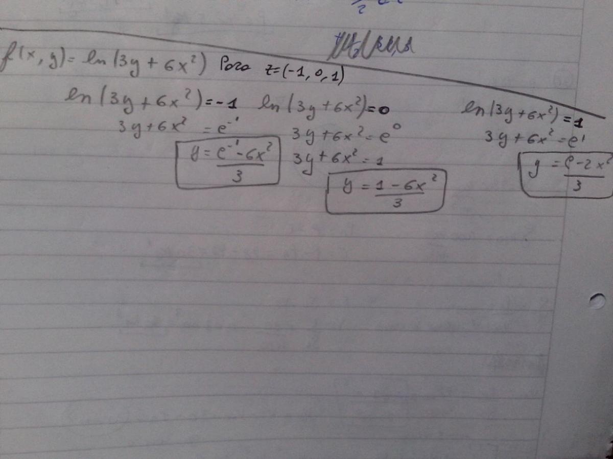 Determinar las curvas de nivel para z=0,1,-1 f(x,y)=ln (3y+6x∧2) y graficarlas