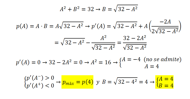 Se sabe que la suma de los cuadrados de dos números positivos A y B vale 32. Calcular dichos números para que su producto A.B sea máximo.