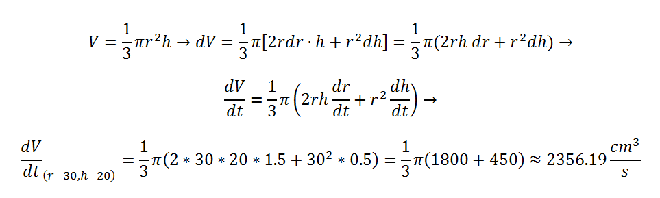 V ' (t) = (1/12)π * 2*d(t)*d ' (t) * h(t) + (1/12)π * d(t)2 * h ' (t),