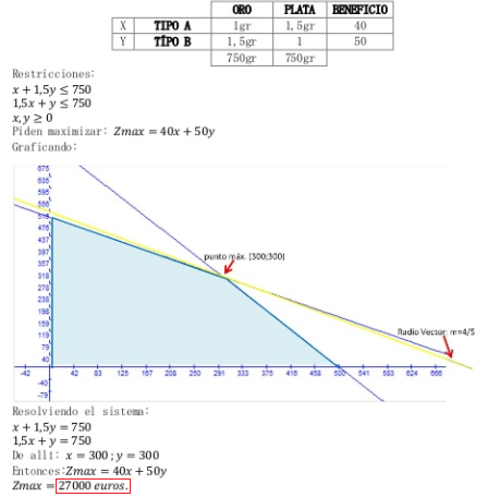 Un orfebre fabrica dos tipos de joyas. Las del tipo A contienen 1 g de oro y 1.5 g de plata y las venden a 40 euros cada una.Para la fabricación de las del tipo B se emplea 1.5 g de oro y 1 g de plata , y las vende a 50 euros.El orfebre tiene solo en el taller 750 g de cada uno de los metales. Calcular cuanto deberá obtener como beneficio máximo.