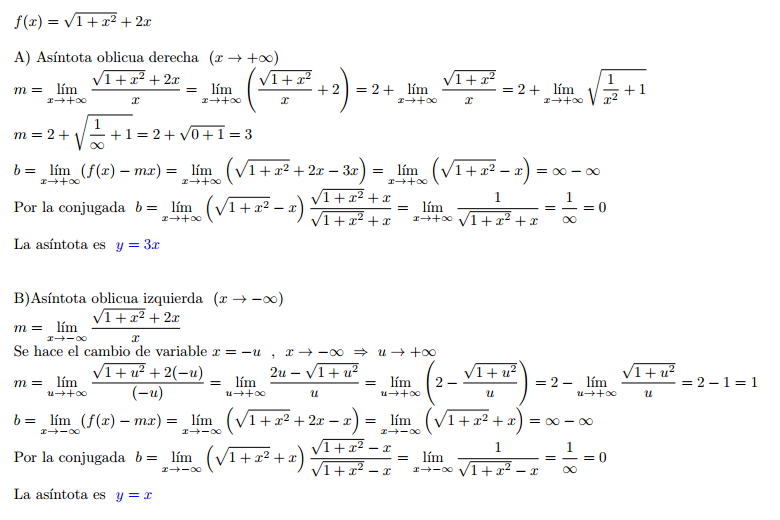 Hablando ya del ejercicio , las asintota oblicuas (si existen ) se calcula cuando x tiende a +infinito y cuando tiende a -infinito.