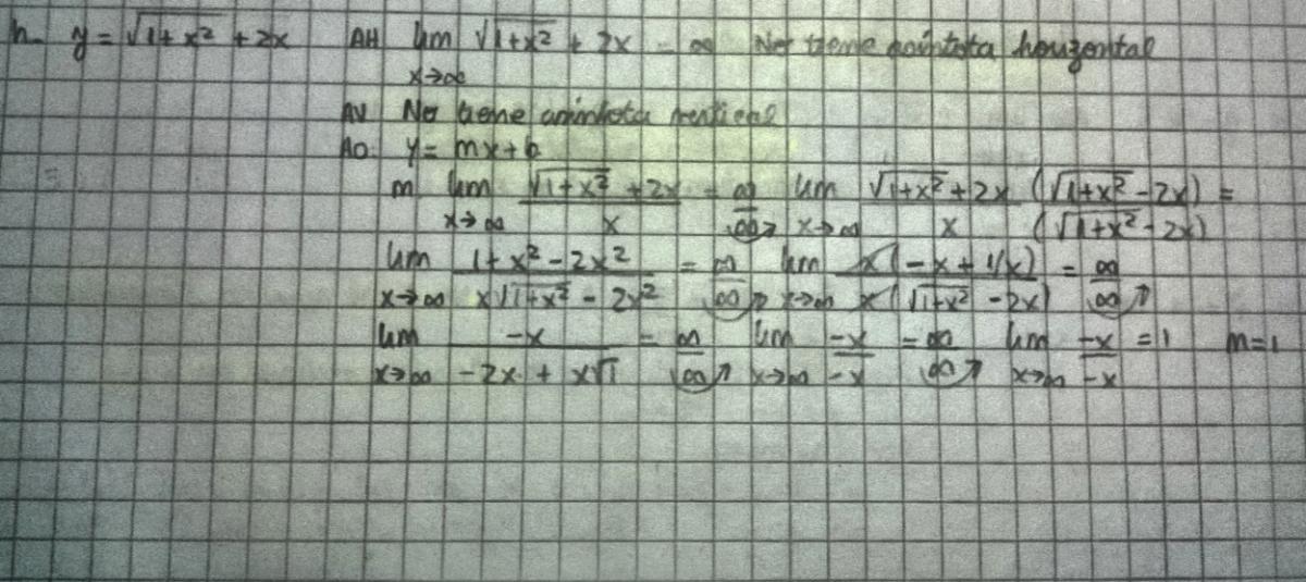 En la resolución de este ejercicio (hallar ecuaciones de las rectas asíntotas) me da como solución de las asintotas oblicuas y=3x e y=x. Por lo que los valores de m tienen que ser 1 y 3. Pude hallar el valor de m=1, pero no se me ocurre como podría hallar m=3. Si alguien pudiera ayudarme se los agradecería