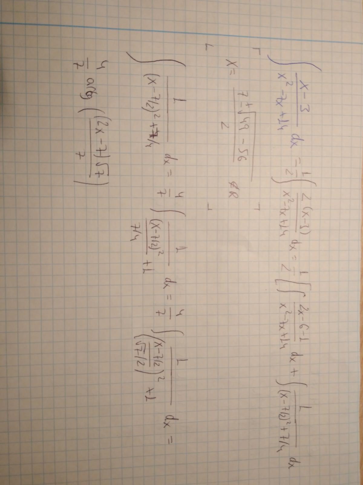 Hola!!! Tengo un problema con esta integral racional con números complejos en el denominador. Ya sé que el resultado me tiene que dar un logaritmo neperiano más una arcotangente. El logaritmo neperiano lo resuelvo sin problemas pero la segunda integral está mal y no sé porqué. A mí me da lo que pone en la imagen adjunta; pero tengo una aplicación que resuelve integrales y da diferente. A mi me da 4/7 por la arcotangente y en la aplicación me aparece 2/√7, justo la raíz de los dos. No sé porqué es así, espero que me hayáis entendido un saludo