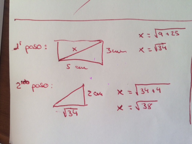 Hola, me podeis ayudar con el problema "Calcula la diagonal de una caja de altura 2 cm y cuya base es un rectángulo de lados 3cm y 5cm"