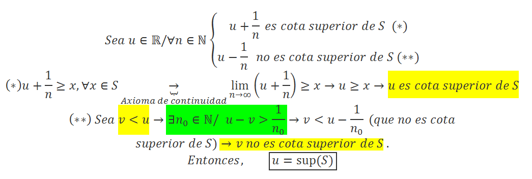 Nos dan un subconjunto R de los reales, no vacío y acotado superiormente. Hay que demostrar que u∈ℛ es el supremo de S si y sólo si para cada n∈ℕ, u+(1/n) es cota superior de S y u-(1/n) no lo es.