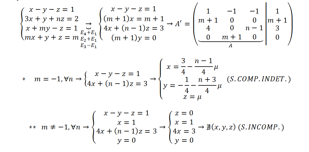 Discutir (argumentar el número de soluciones) del siguiente sistema de ecuaciones según los valores de los parámetros m y n: