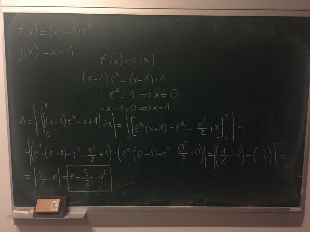 Tengo problemas para llegar a ver que al igualar (x-1)(e^x)=(x-1), las soluciones son x=0;x=1. Es obvio que al tratarse de una integral definida limitada por dos funciones, debería tener al menos dos puntos de corte, pero no acabo de entender la resolución.