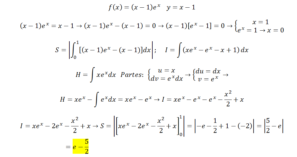 Calcular el área comprendida entre la curva y = (x − 1)ex y la recta y = x − 1.