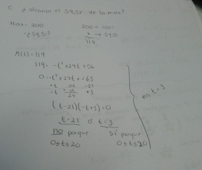 c) Calcula en qué instante se alcanza el 59,5 % de la cantidad máxima de sustancia en el