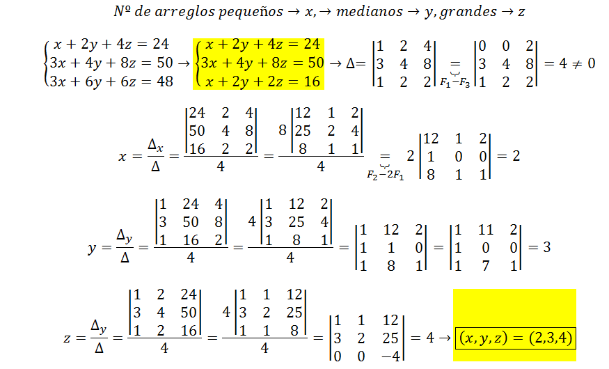b. Usando la regla de Cramer, resuelva el inciso (a) para determinar cuántos arreglos de cada tipo habrá hecho.