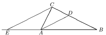 Por C tiramos una paralela a la bisectriz AD. Sea E el punto en que corta la prolongación de la recta BA. Los ángulos ∠BAD, ∠AEC y ∠ACE son iguales. [Por qué?]