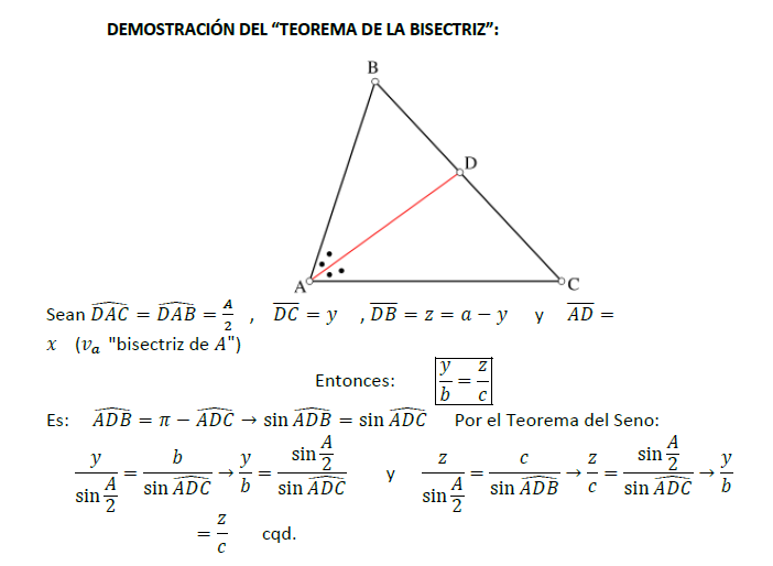 Demostración. Dado el triángulo ΔABC, hacemos la bisectriz AD al ángulo ∠CAB.