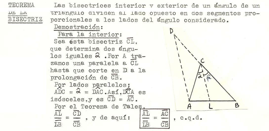 Teorema. La bisectriz en el ángulo ∠CAB del triángulo ΔABC, divide el lado opuesto CB en dos segmentos CD y DB proporcionales, respectivamente, a los lados AC y AB.
