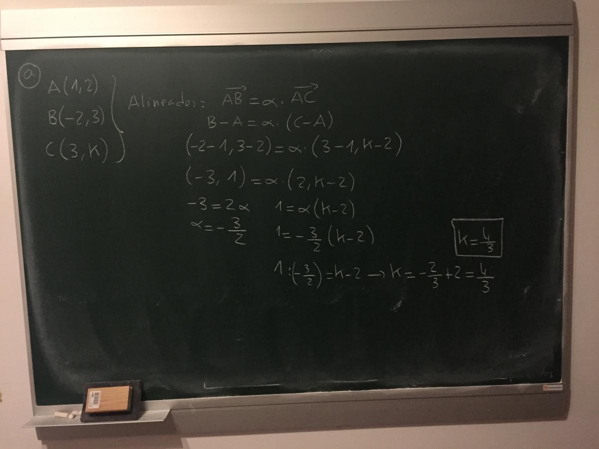 -Determina k para que los puntos A(1,2), B(-2,3) y C(3,k) estén alineados.