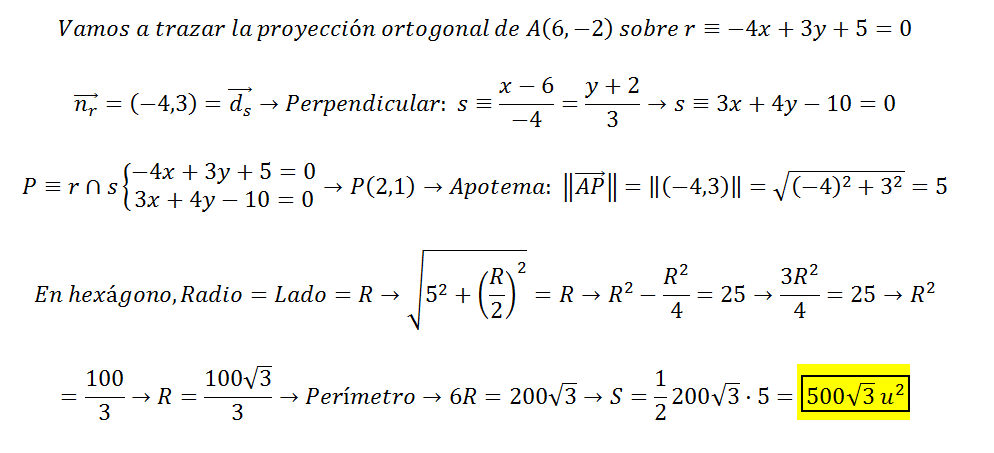 Ayuda por favor, es urgente!!! El centro de un hexágono es el punto A (6, -2) y un lado se encuentra sobre la recta de ecuación -4x + 3y + 5 = 0. Determina las coordenadas de los vértices y el área.