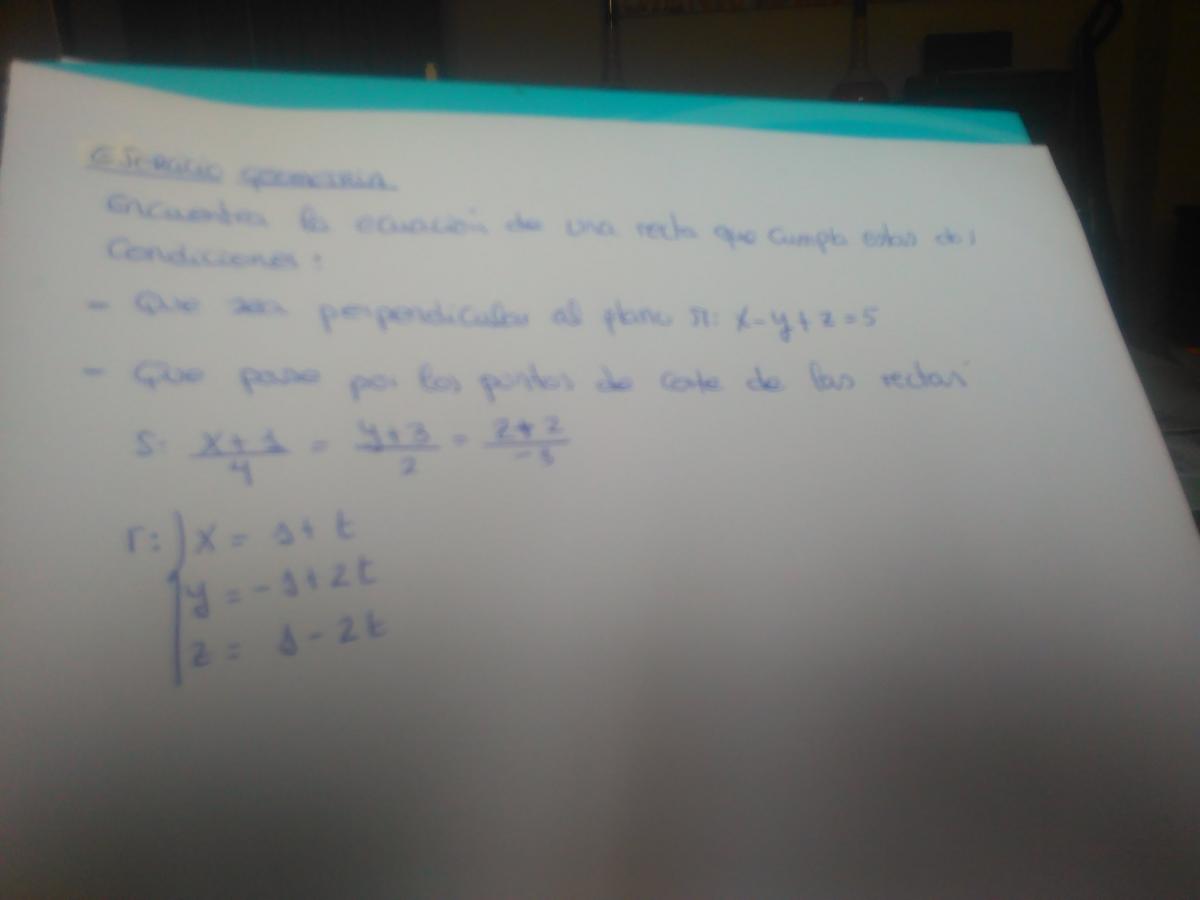 Hola en este ejercicio entiendo que hay que calcular una recta "t" que corte a las rectas s y r (son rectas que se cruzan) y que además esa recta y sea perpendicular al plano π.