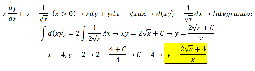 C es la constante de integración (obligatoria). Para determinar su valor, sustituimos las condiciones iniciales (x=4, y=2)