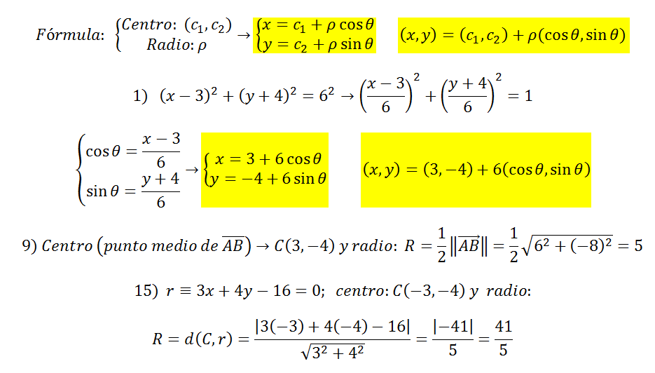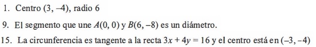Tienes que el radio es la distancia entre el centro y el punto A: R = d(AC) = √( (3-0)2 + (-4-0)2 ) = √(9 + 16) = √(25) = 5.