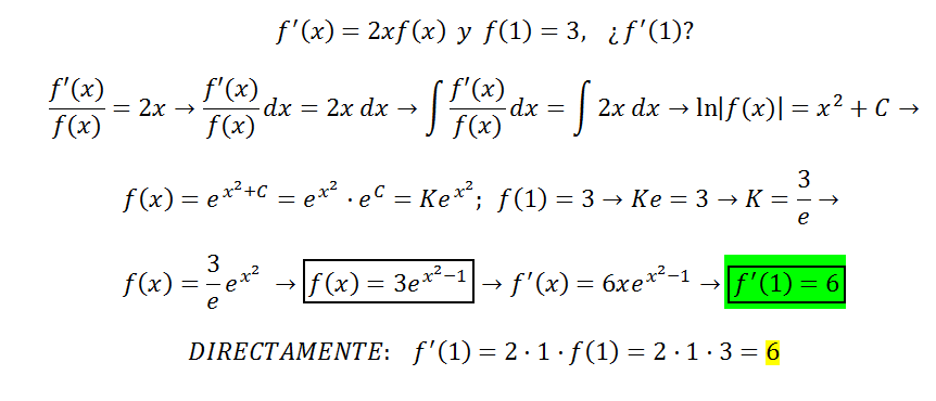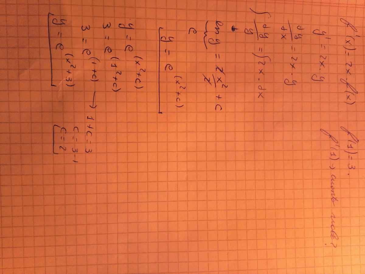 Hola,el ejercicio dice sabemos que f´(x)=2x f(x) y que f(1)=3 ¿Cuanto vale f´(1)? El tema es de ecuaciones diferenciales!
