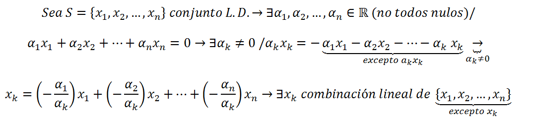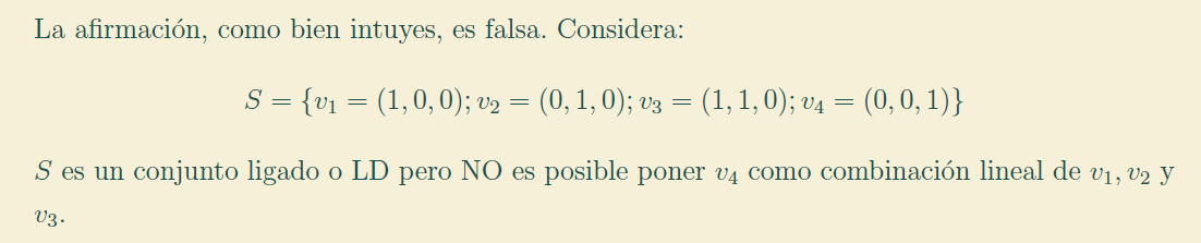 Hola buenas tardes, tengo dudas acerca de esta afirmación la cual creo que es falsa pero no estoy seguro. "s un conjunto es LD , entonces todo vector del conjunto puede expresarse como CL de los restantes" eso cierto esto?