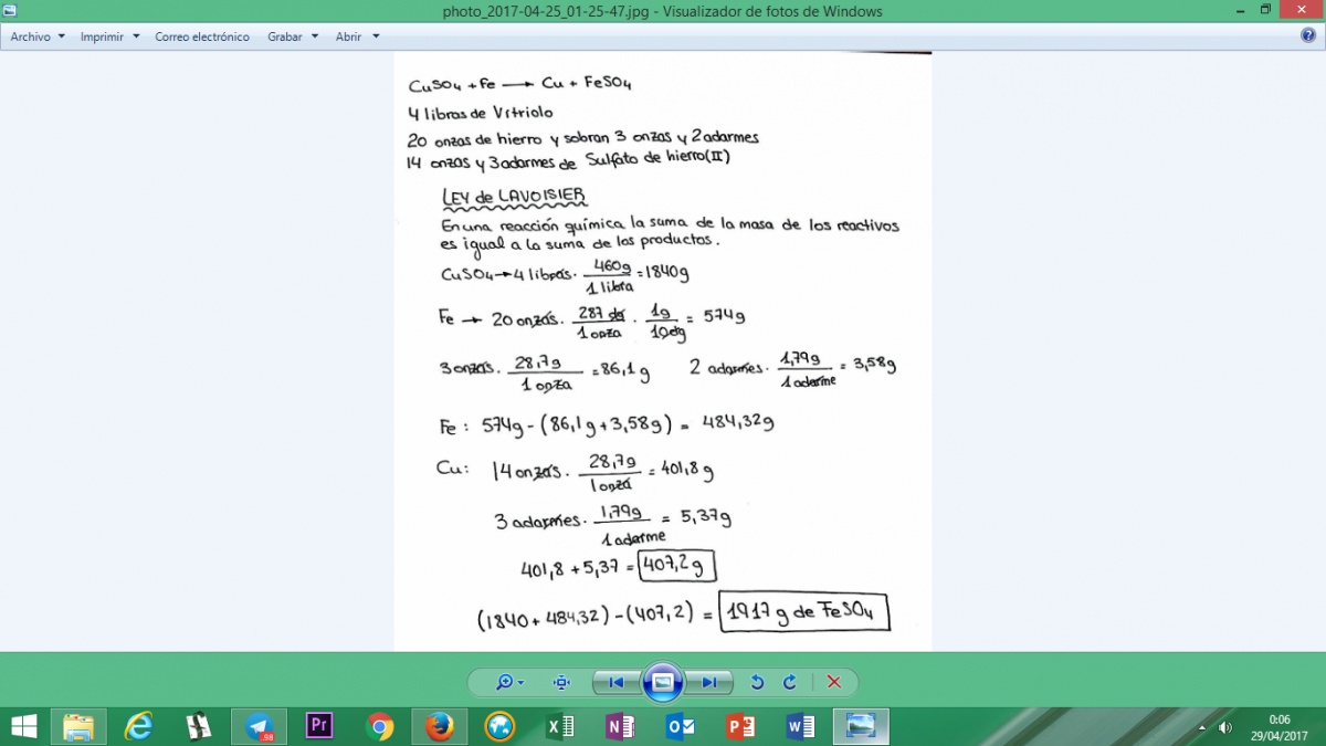 Si se utilizaron 4 libras de Vitriolo y 20 onzas de hierro y se han obtuvieron