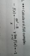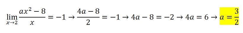 Lím(x→2) f(x) = Lím(x→2) (ax2-8)/x = observa que el límite existe y es directo = (a*22 - 8)/2 = (4a -8)/2 = 4*(a - 2)/2 = 2*(a - 2).