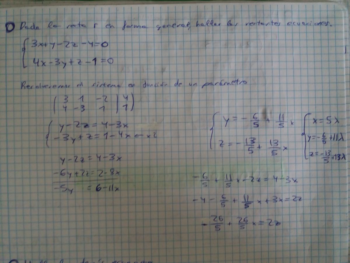 Resuelve un sistema compatible indeterminado con tres incógnitas. Pone las y,z en función de x (incógnita libre), le asigna el valor 5λ (por estética, para que no queden denominadores). La recta pasa por (0,-6/5,-13/5) y tiene la dirección del vector (5,11,13) (ecuaciones paramétricas). Pide explicaciones también a tu profesor.