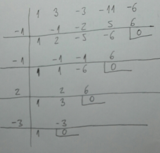 Haciendo RUFFINI obtenemos x1=-1, x2=-1, x3=-3, x4=2 por lo que: