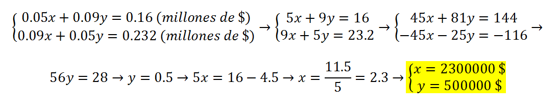 Un inversionista recibe $160.000 por conceptos de intereses de 2 inversiones, con la primera gana el 5% y con la segunda el 9%. El próximo mes las tasas cambiarán y los intereses obtenidos serán de $232.000