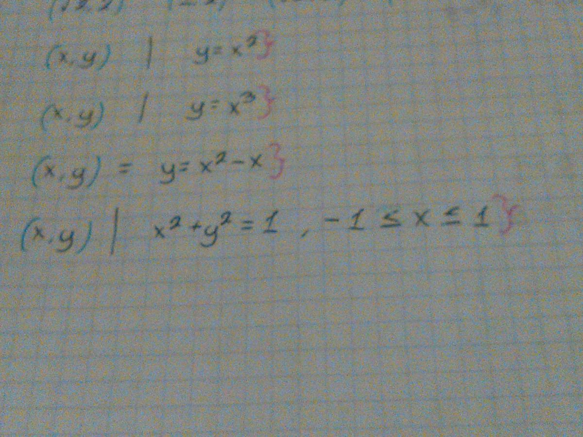 y la última es una relación: en concreto la de la circunferencia de radio 1(no cumple la condición de función bien definida, pues al punto x=0 por ejemplo le corresponderían el menos 1 y el 1