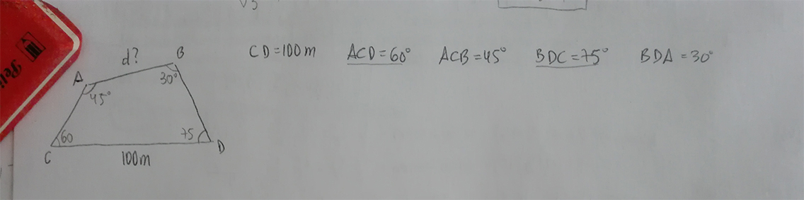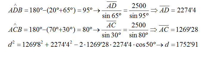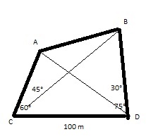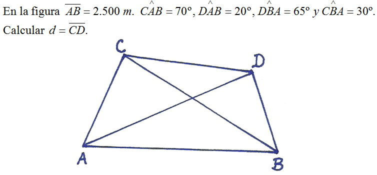 Estoy atascado, llevo haciendo triángulos hasta aburrirme y ahora tengo este ejercicio. Me piden las distancia AB. No necesito el desarrollo completo, con la idea yo lo realizaría. Gracias por adelantado.