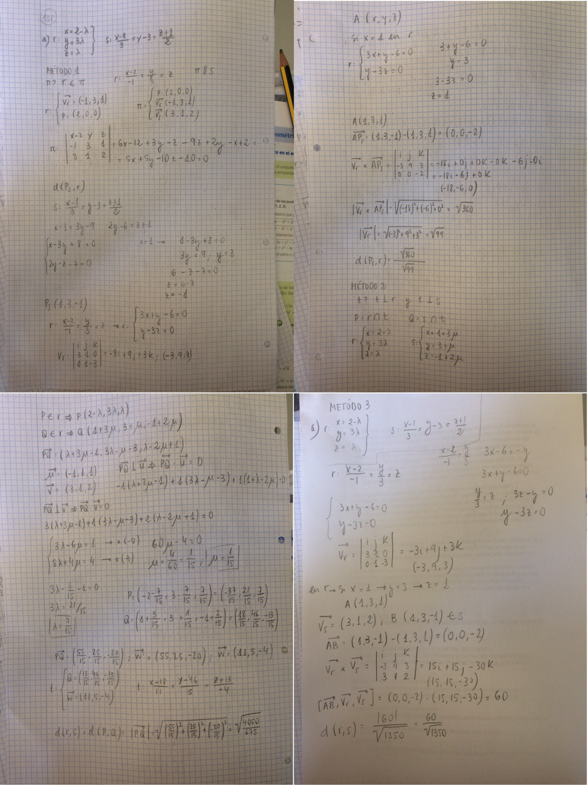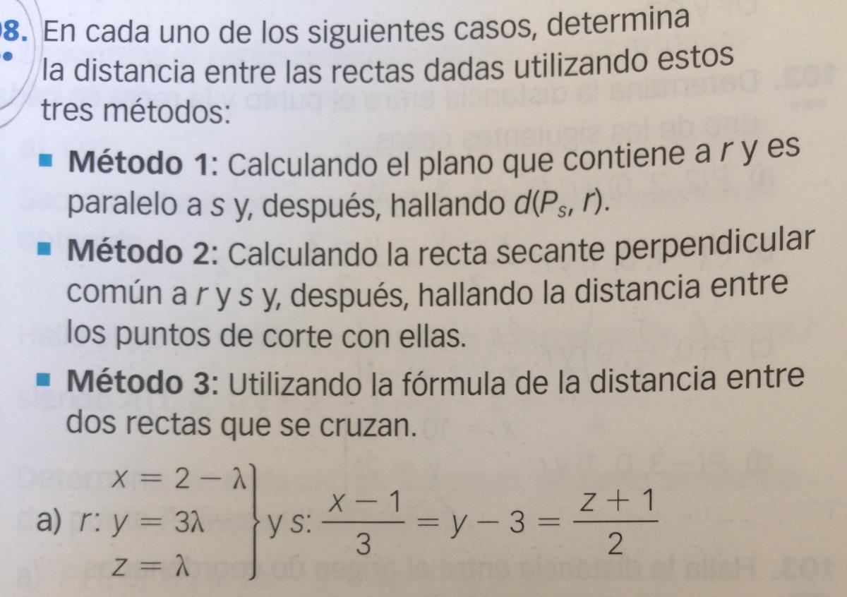 ¡Buenos días! ¿Podría alguien si es tan amable echarme un cable con este ejercicio. Me piden que calcule la distancia entre dos rectas de tres modos distintos y cuando lo hago, no sale la misma distancia. No comprendo del todo por qué. Quizá esté mal planteado, pero no lo veo... ¿Alguna ayuda? Muchas gracias de antemano.