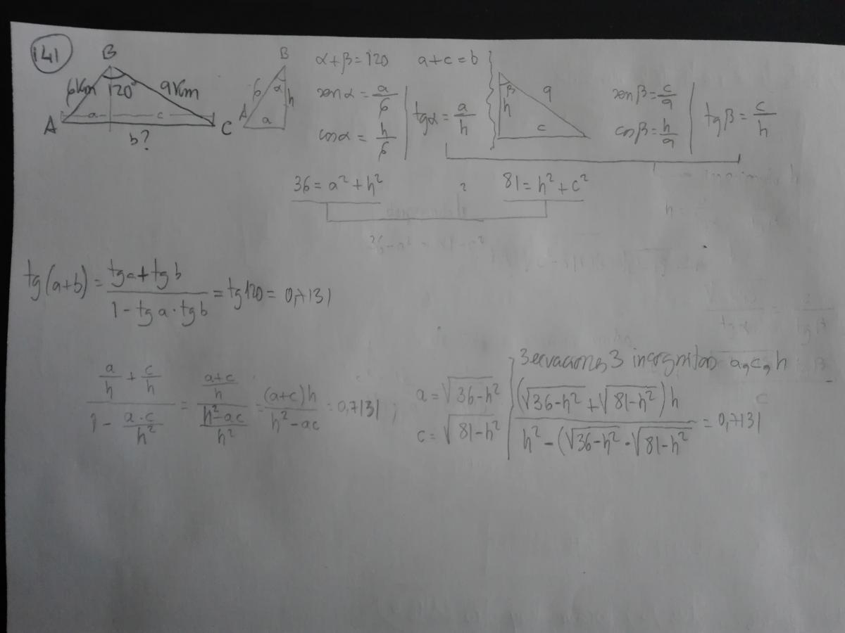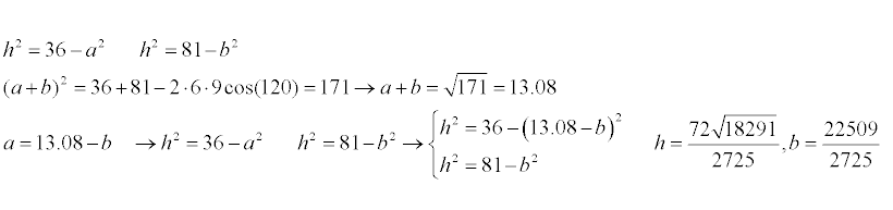 Tengo que hallar distancia AC, con datos AB = 6, BC = 9 y ángulo ABC = 120º. Según mi solución me queda resolver "h" en esa pedazo de ecuación. Seguro que alguno de ustedes tiene otra solución. Gracias por adelantado y un saludo a toda la Comunidad