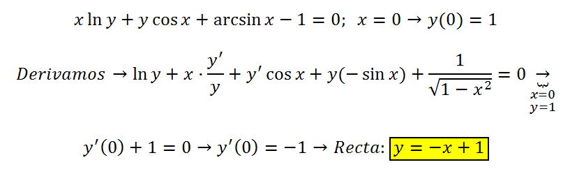 Calcular la ecuación de la recta tangente a la función y = y(x) definida implícitamente por la relación para el punto x = 0.