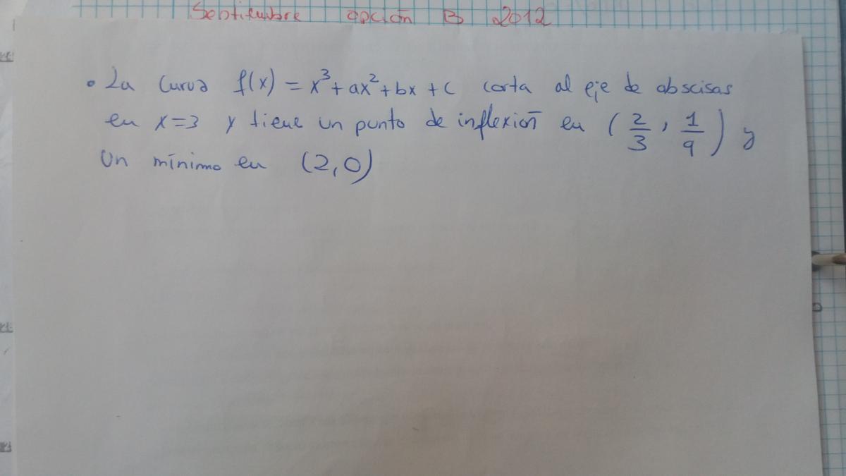 0=3^3+3^2a+3x + c en esta sabes que corta en el punto 0,3 ya que corta al eje de abcisas