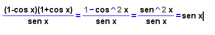 El paso del denominador se aplica que : sen^2 x + cos^2 x = 1 entonces sen x = RC(1-cos^2 x), despues racionalizamos y nos queda 1 - cos^2 x que es una identidad notable (1-cos x)(1+cos x) , quitamos los productos iguales y tenemos RC(1-cos^2 x)