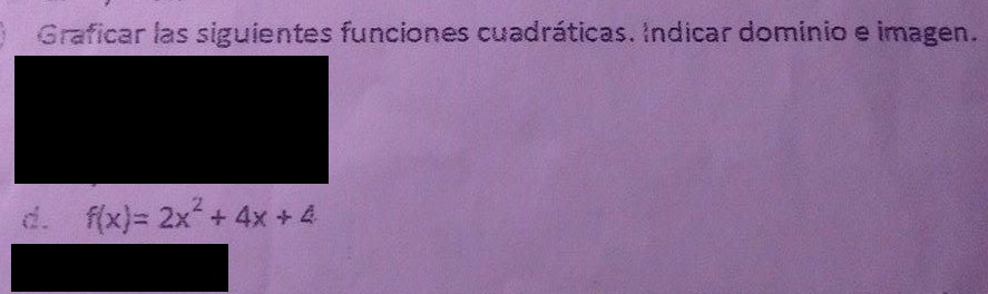 En cuanto a tu ejercicio, el dominio es todo R (-inf,inf) y para encontrar la imagen no tienes que usar esa ecuación...sólo tener en cuenta que es una parábola de la forma ax2+bx+c y para hallar su vértice usar la fórmula V=-b/(2a), y en este caso como a=2 y es mayor que cero, entonces ese vértice será un mínimo.