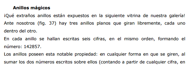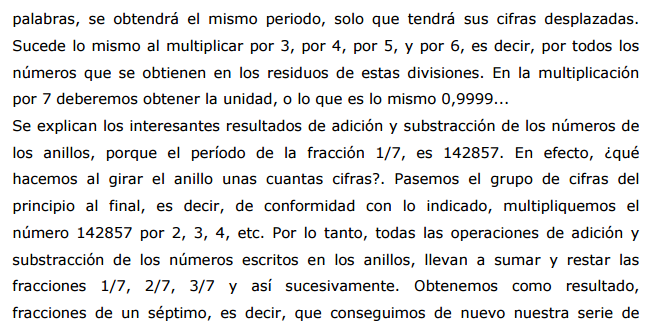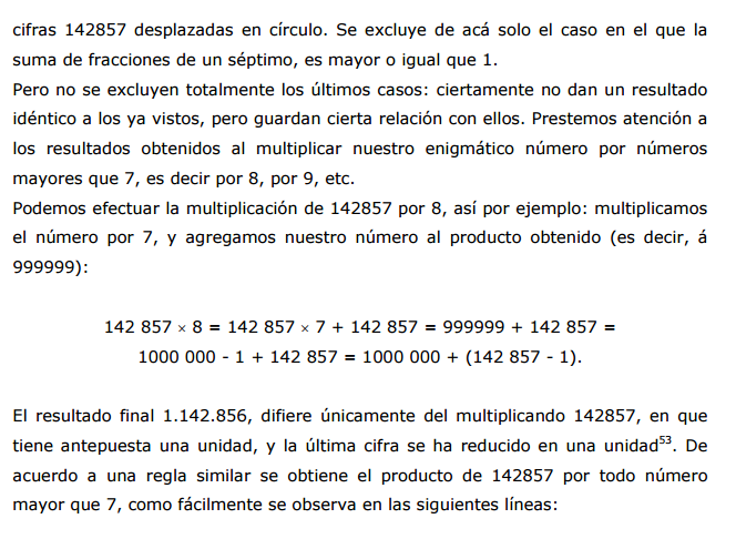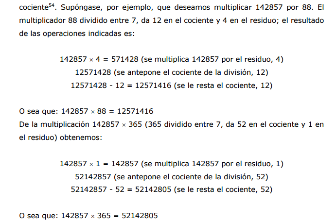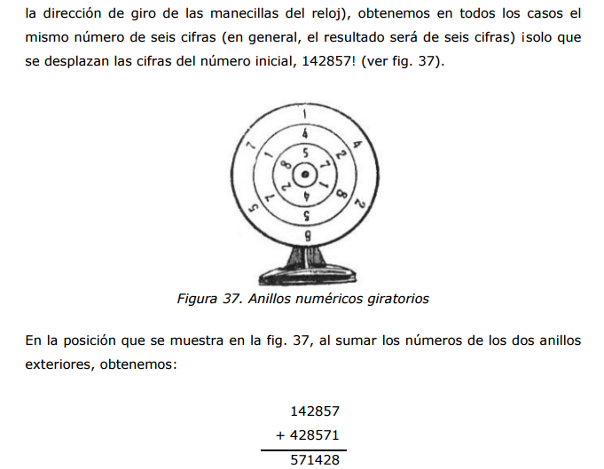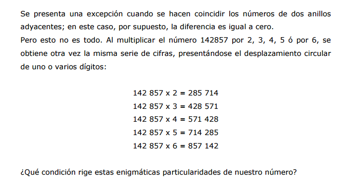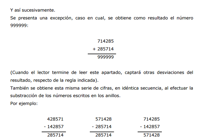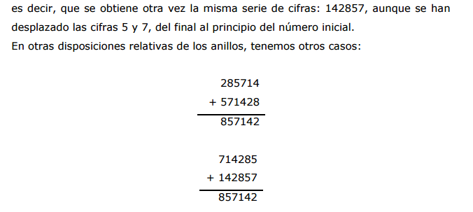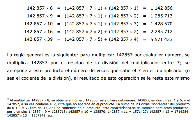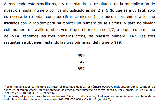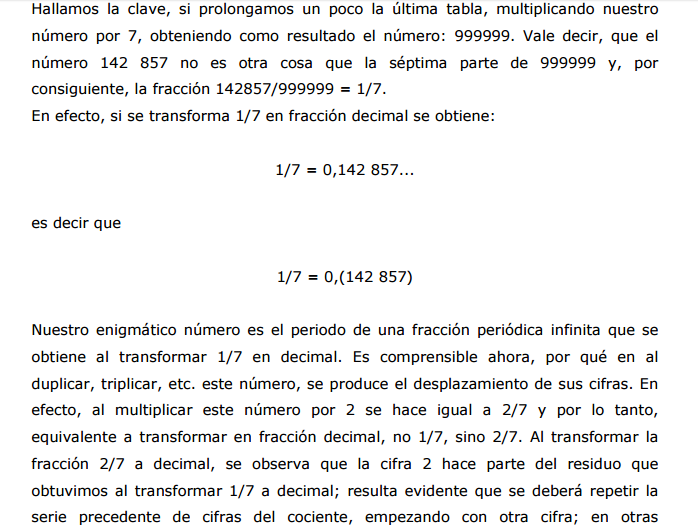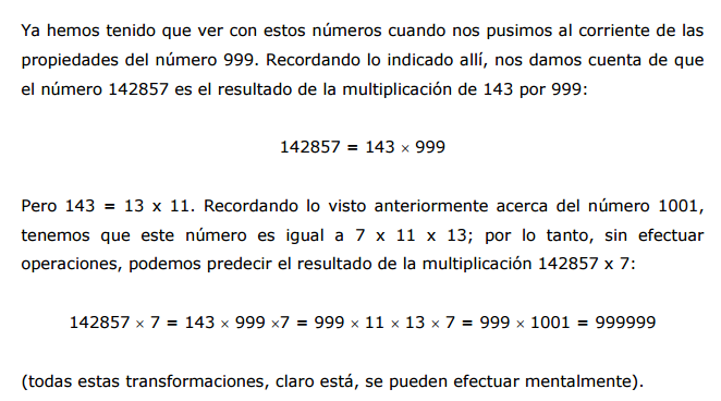 El resultado de dividir 999999 en 7 es 142857, el número más fascinante que puedas hallar y te darás cuenta al multiplicarlo por cualquier número que no sea múltiplo de 7 que en su resultado se conserva el 142857. (Agrúpalo de 2 cifras para entenderlo mejor)